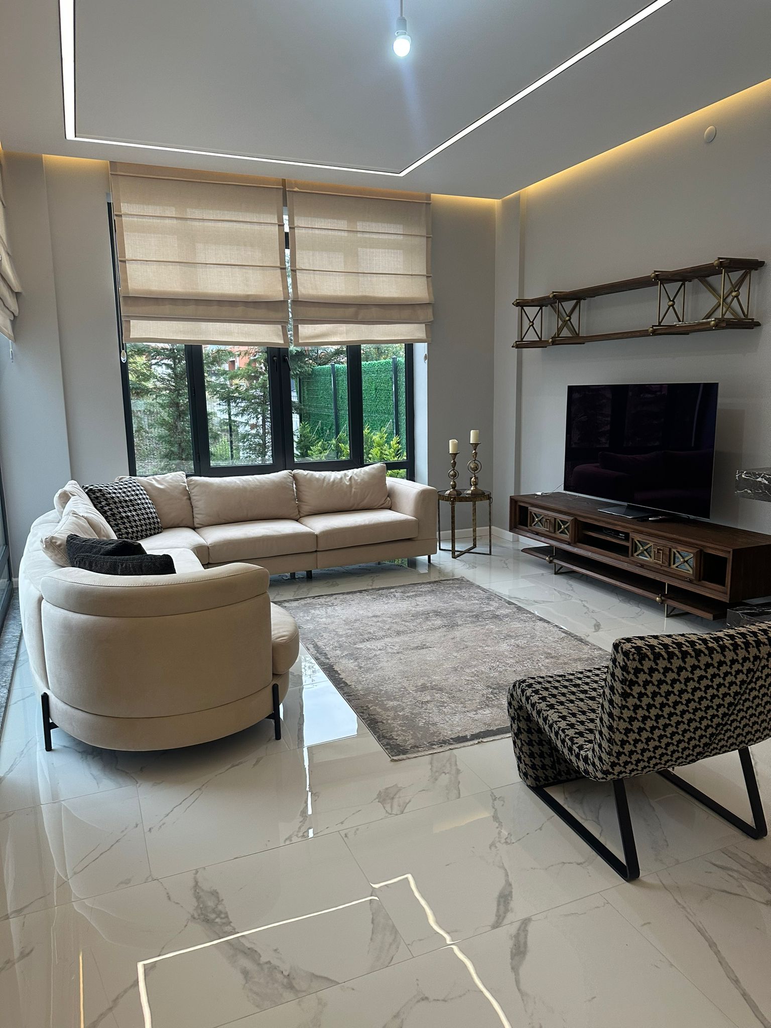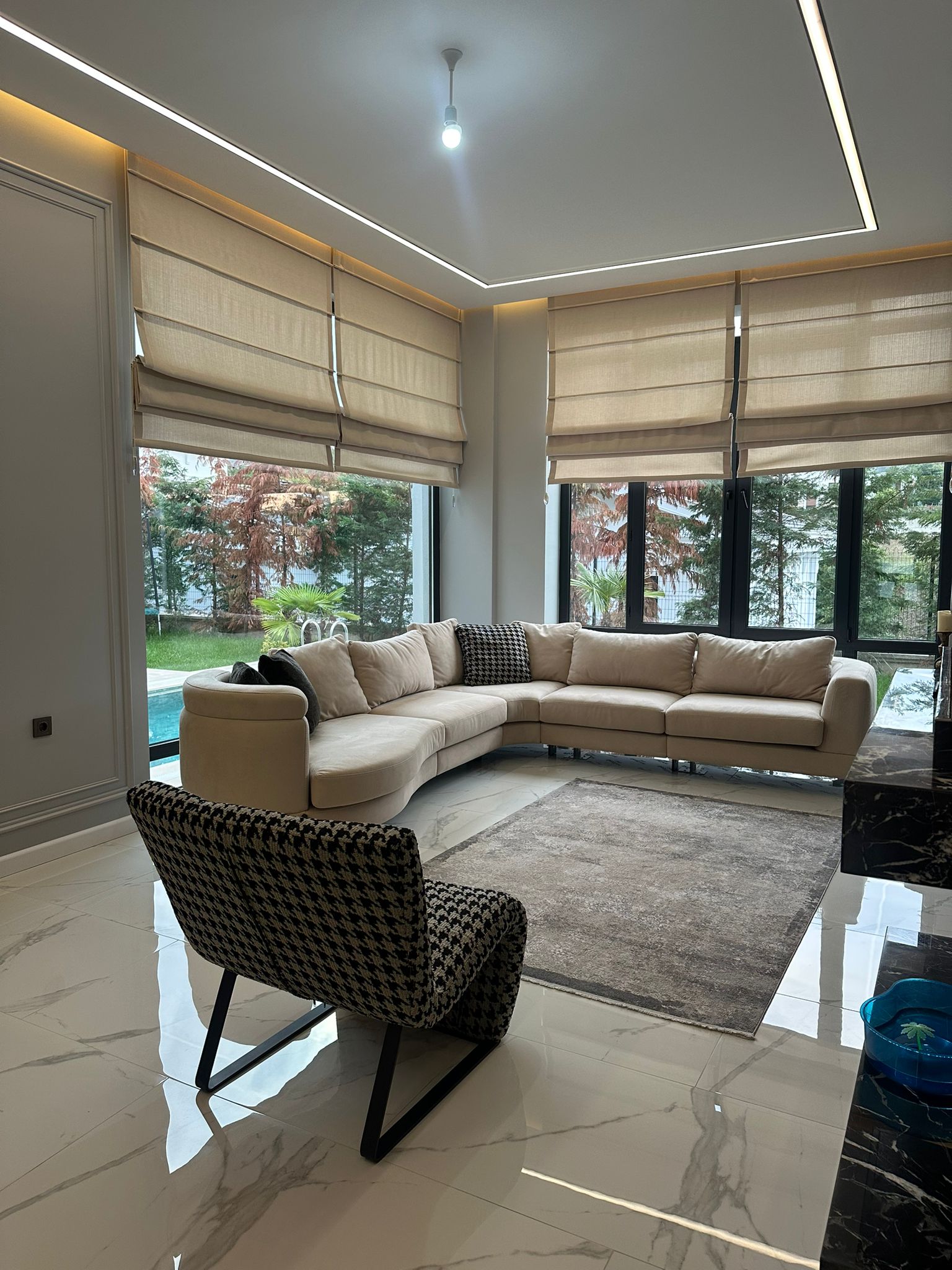 Beyaz koltuklar ise, odadaki diğer renklerle dengeli bir şekilde birleşiyor. Beyazın sade ve ferah yapısı, mekânı aydınlık ve geniş gösterirken, diğer unsurların şıklığını vurguluyor. Koltukların rahat yapısı, yemek odasına konfor ve şıklık katıyor, tasarımın genel estetiğiyle mükemmel bir denge oluşturuyor.