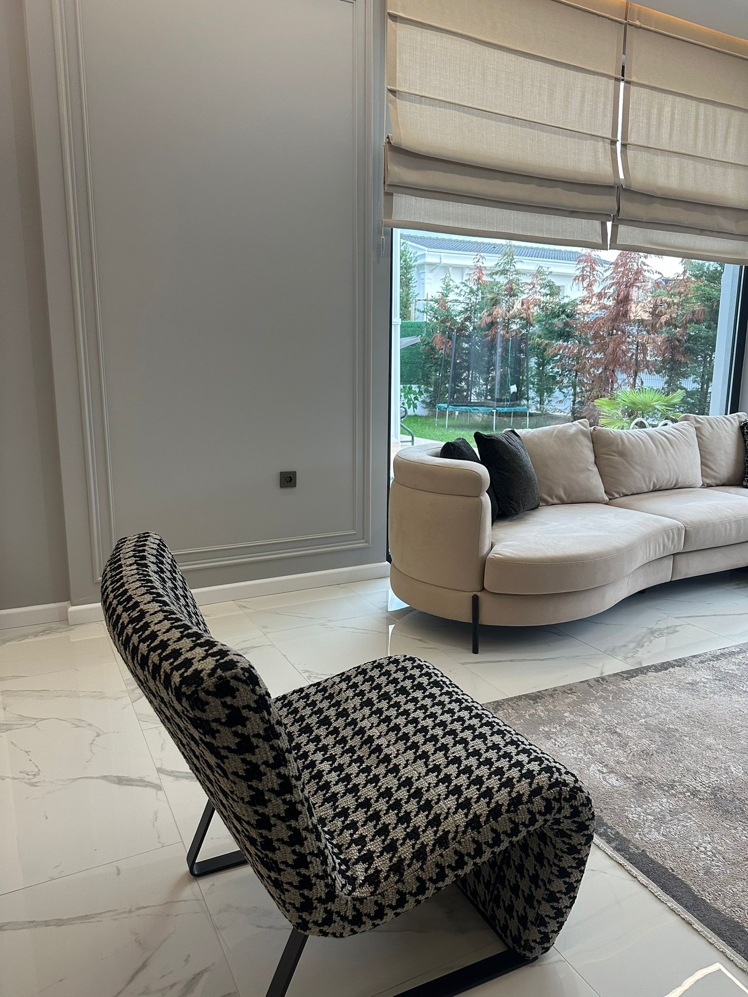 Siyah sandalyelerin zarif çizgileri, odanın modern havasını pekiştiriyor ve gold detaylarla birleşerek mekâna lüks bir dokunuş ekliyor. Gold aksanlar, sandalyelerin ayaklarında ve koltuklarda kendini göstererek, tasarımı zenginleştiriyor ve odadaki diğer unsurlarla mükemmel bir uyum sağlıyor.
