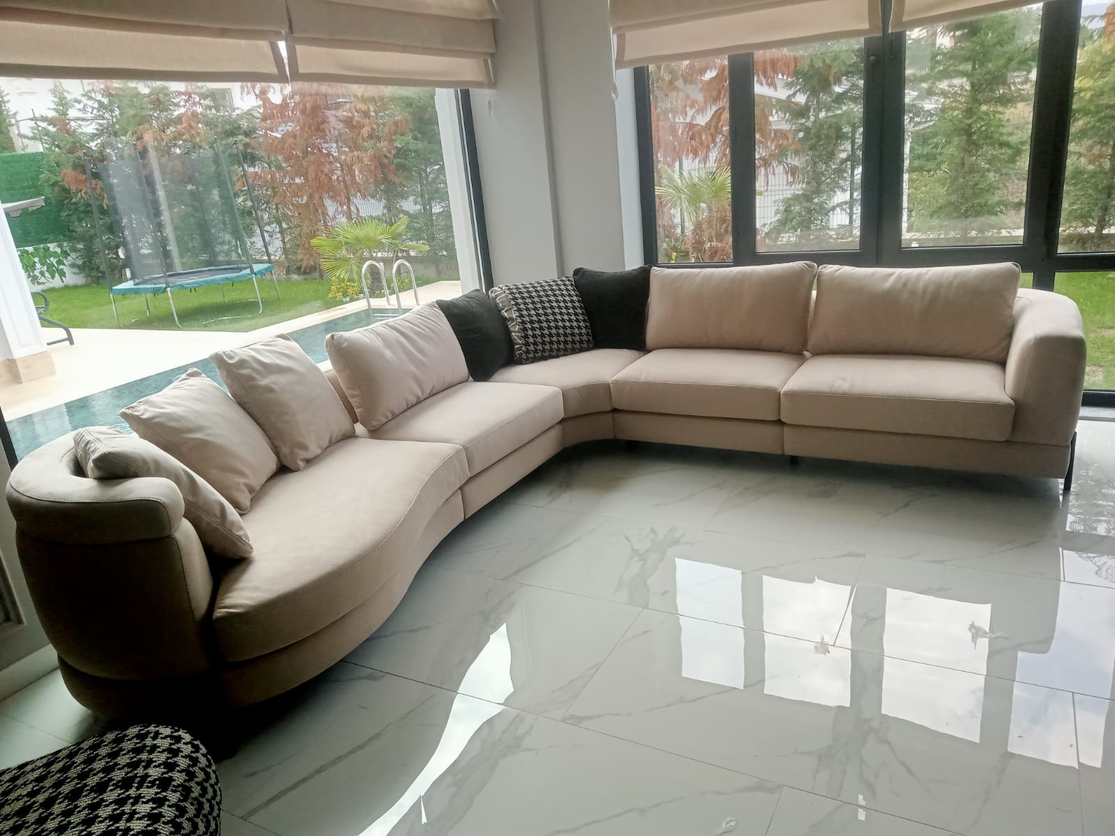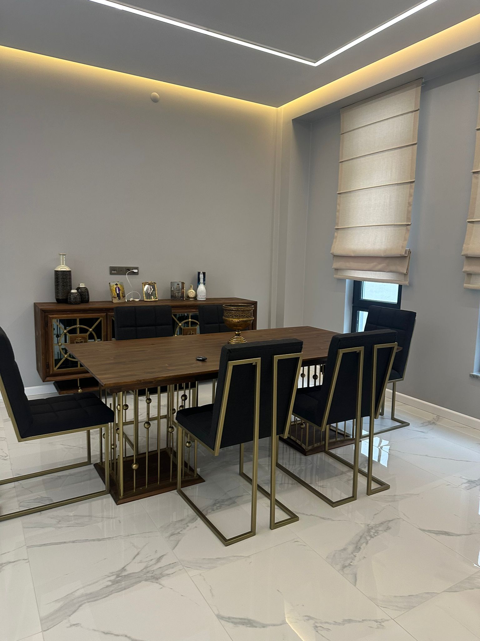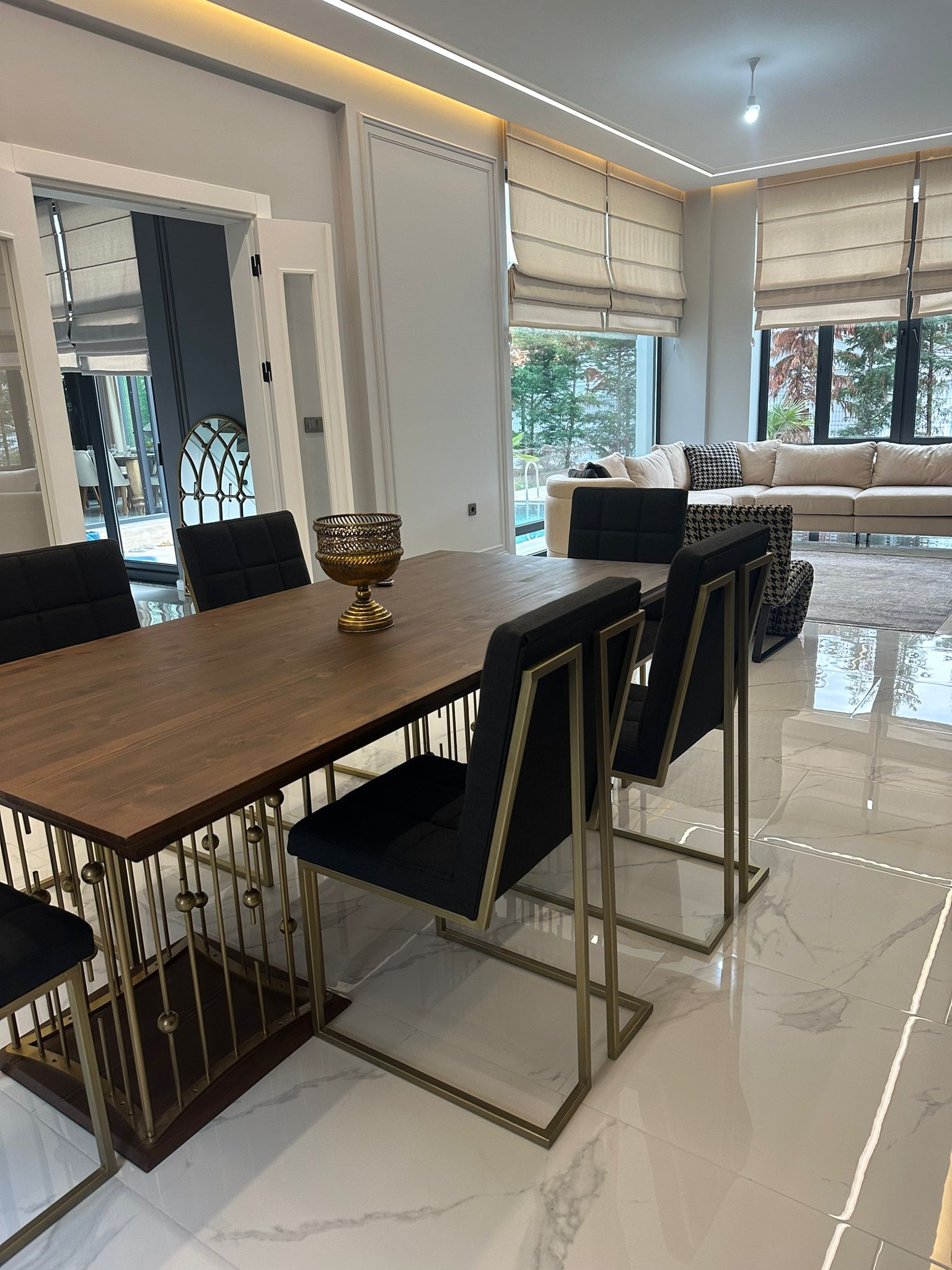 Bu özel tasarım yemek odası, ahşap masanın doğal sıcaklığı, siyah sandalyelerin zarif modernliği, gold detayların lüks dokunuşu ve beyaz koltukların ferahlatıcı etkisiyle mükemmel bir uyum yakalıyor. Ahşap masanın doğal dokusu, sıcak ve davetkâr bir atmosfer yaratırken, siyah sandalyelerle oluşturulan kontrast, mekâna şıklık ve sofistike bir hava katıyor. Ahşap masa, sadece görsel olarak etkileyici değil, aynı zamanda dayanıklı ve işlevsel yapısıyla da öne çıkıyor.