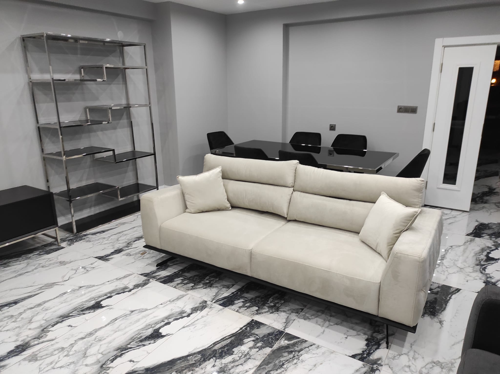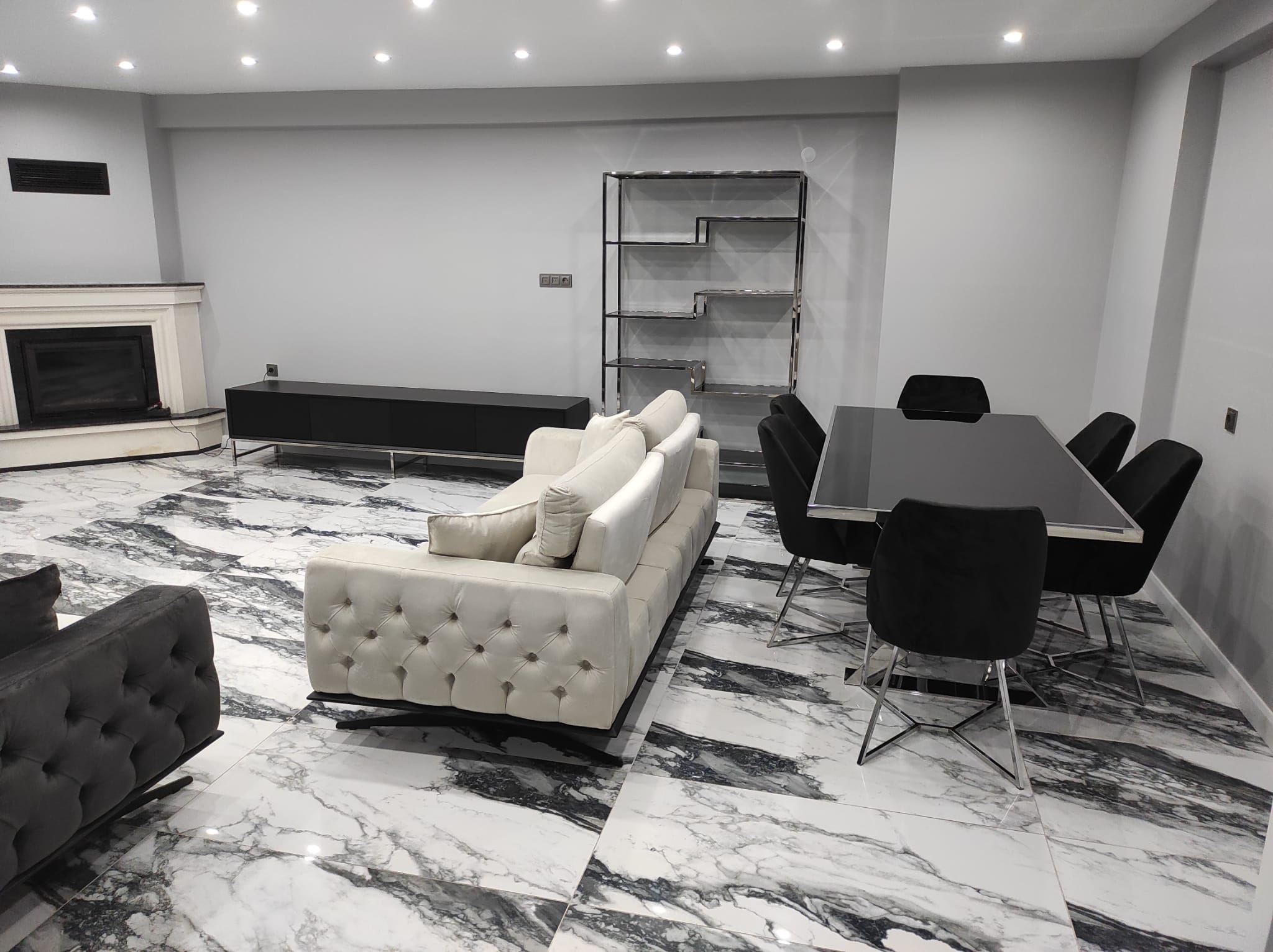 Bu oturma odası, siyah ve beyazın zarif kontrastı, modern çizgileri ve işlevsel öğeleriyle şık bir atmosfer sunuyor. Siyah ve beyaz koltuklar, mekâna zarif bir denge katarken, sade ama şık tasarımlarıyla dikkat çekiyor. Beyaz koltuklar, odanın ferah ve aydınlık görünmesini sağlarken, siyah koltuklar derinlik ve sofistike bir hava ekliyor. Bu renk kombinasyonu, odadaki diğer unsurlarla mükemmel bir uyum içinde çalışıyor.